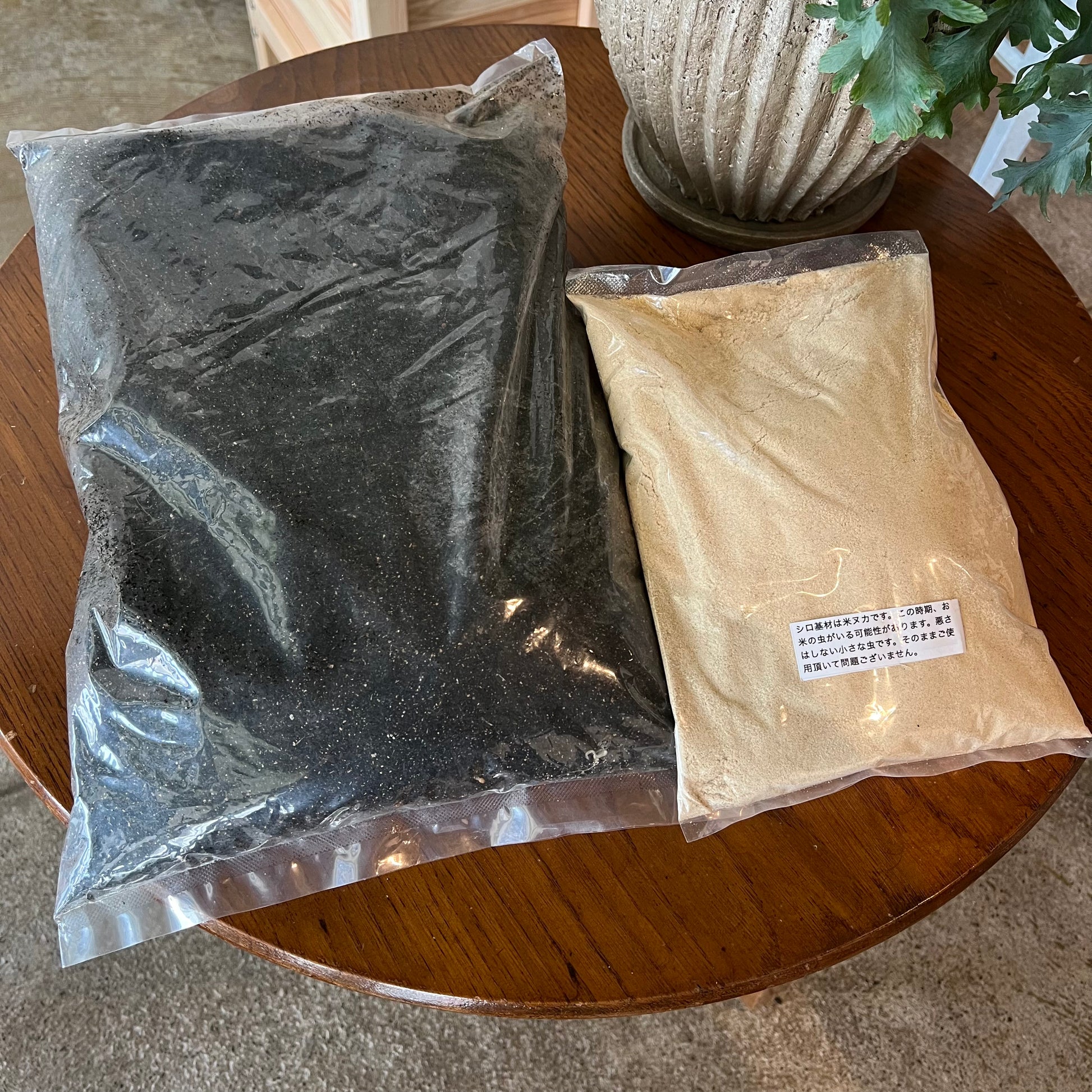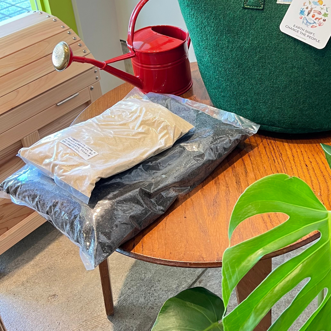 (古い基材は約3週間、袋や箱にいれて熟成させると良い堆肥になります。) AgriPoucher®︎コンポスト基材は2種セットになっています。 シロ基材は国産の米糠を使用し、クロ基材はオリジナルレシピです。
